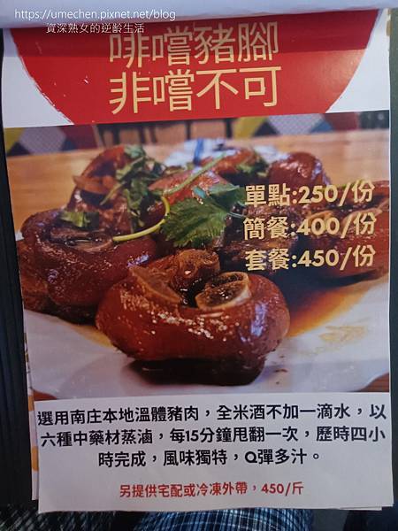 看看介紹:用6種中藥蒸滷、每15分鐘甩翻一次、歷時4小時……,哇!這豬腳餐讓人太有興趣了。