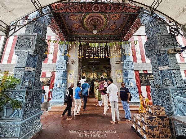 快靠近 維拉瑪卡里亞曼興都廟時,已感受到人潮變多,廟宇有前後門,兩邊的出入口都有許多進出的人群,我們先走到後門的馬路,並朝庭院區域觀望了一下,最後還是由正門入內。