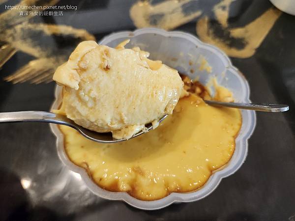 傳統布丁的口感較為紮實,仔細看有一些蒸氣孔洞,並不是十分滑順的那種,還有一層偏硬的表層。底部有一層深色的焦糖,所以口感很有層次。